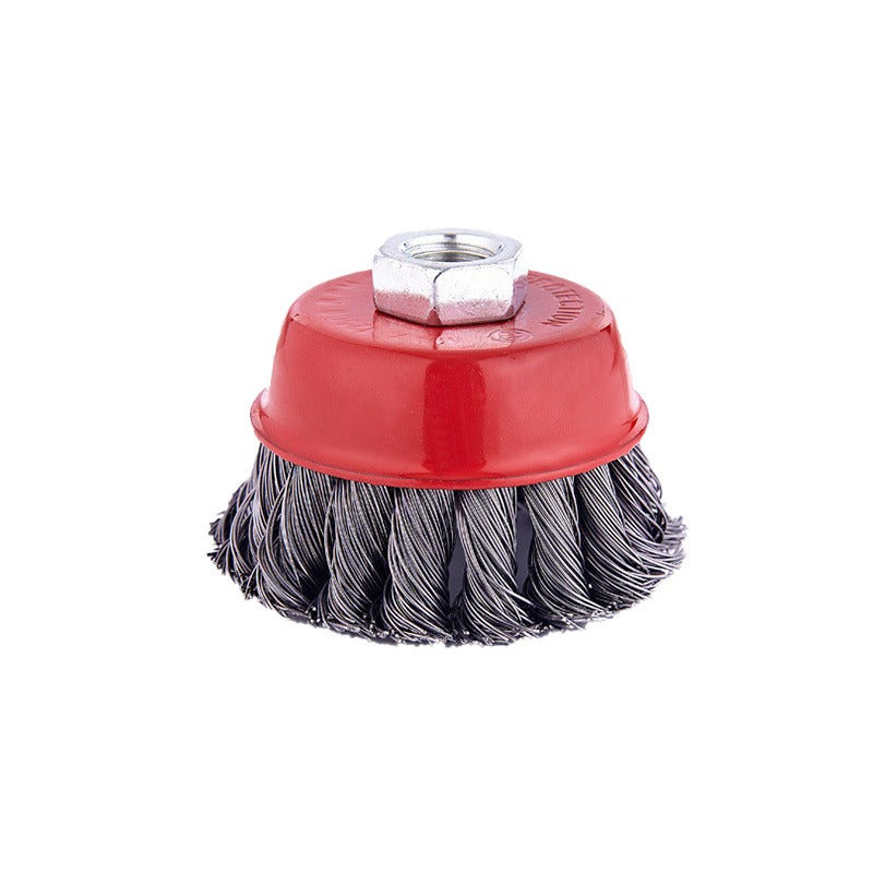 Cepillo de copa con alambre entorchado de 4 pulgadas que se monta en tu esmeril angular. Agresivo y duradero para limpiar, desoxidar y preparar metal rápido.