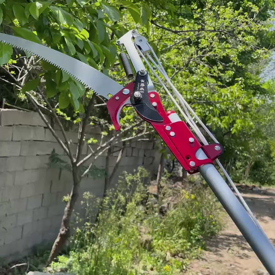 Tijera de altura telescópica con serrucho integrado que te permite podar Y cortar ramas altas desde el suelo. Dos herramientas en una, sin escalera, sin riesgo.